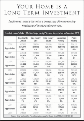 Just in case you need to be reminded, regardless of the ups and downs in real estate, this report shows you just how good real estate has been for us! Yes, we’ve had a little down cycle this past 14 months in Snohomish County, but our area has too many economic hubs to let a little housing market downturn have a huge impact for very long. Hang in there! If you are a Buyerm, this is a great time to buy! As soon as I can figure out how to link or display the latest graph, I will!